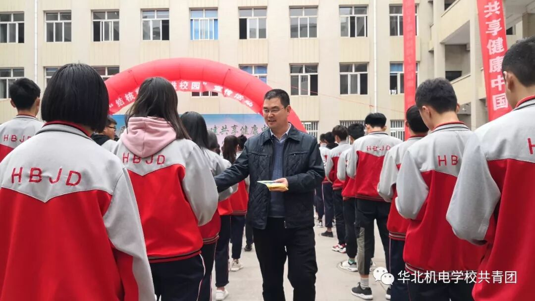我校领导为学生发放防治结核病宣传资料。